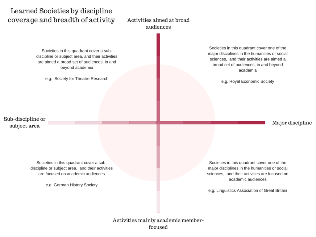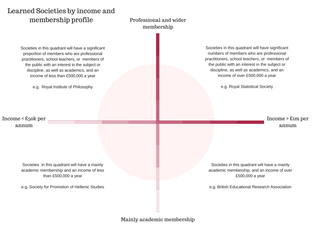 Since societies vary hugely in accordance with these and other dimensions, it is important as a first step in reading this guidance to locate your society in the broader landscape of learned societies in the arts, humanities and social sciences. What is appropriate for one society may not be appropriate for another; and it may help to identify societies with similar characteristics. To help in this, we have mapped societies in two sets of quadrants according to: